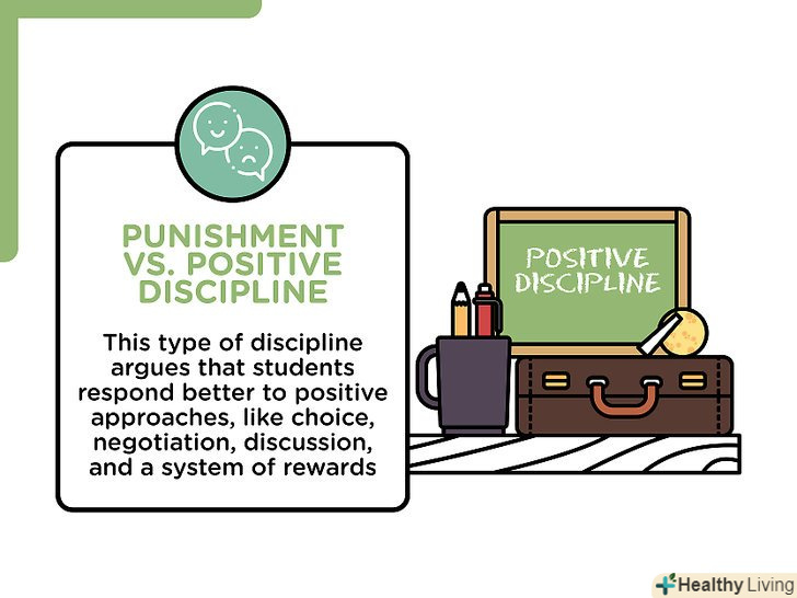 Зрозумійте різницю між покаранням і позитивними виховними заходами.позитивні виховні заходи-Це такий вид виховних прийомів, який використовує позитивні ненасильницькі виховні методи для демонстрації дитині шанобливого ставлення, заохочення його хорошої поведінки і корекції поганого. На відміну від покарань, позитивні виховні заходи не апелюють до почуття сорому, висміювання, а також агресивних або насильницьких заходів корекції поведінки. Дані виховні заходи ґрунтуються на тому, що учні краще реагують на позитивний підхід, коли їм дають право вибору, проведення переговорів, обговорень і знайомлять з системою заохочень. [10]- Будучи вчителем, із застосуванням позитивних виховних заходів ви зможете домогтися більшого контролю над поведінкою класу, так як будете стимулювати учнів на здійснення самостійного вибору і прийняття рішення щодо своєї поведінки, а не намагатися насильно затвердити належні правила поведінки. Даний вид виховання здатний на тривалий час встановити в класі мирну атмосферу, так як учні навчаться самостійно себе коригувати і самостійно вирішувати виникаючі в класі проблеми.
