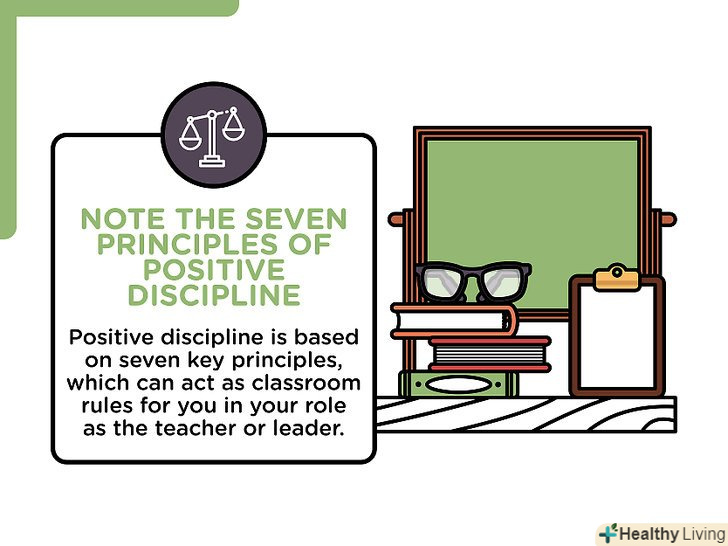 Запам'ятайте сім принципів позитивного виховання.позитивні виховні заходи ґрунтуються на семи ключових принципах, які можуть бути використані в якості правил поведінки в класі для самого вчителя, що є для учнів їх лідером. Ці сім принципів виглядають наступним чином:[11]- Ставитися до учнів з повагою;
