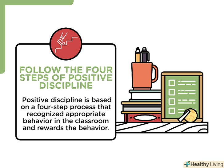 Застосовуйте заходи позитивного виховання на практиці.коли будете застосовувати на практиці заходи позитивного виховання, дотримуйтесь правило чотирьох до одного. Воно полягає в тому, що на кожне помічене неналежну поведінку ви повинні постаратися чотири рази відзначити хороше в поведінці класу. Послідовно дотримуйтесь дану пропорцію, так як вона покаже вашим учням, що ви більше зацікавлені в правильній поведінці і його заохоченні, ніж в покараннях.[13]- Пам'ятайте про те, що позитивні виховні заходи можуть не дати належного результату, якщо ви не будете своєчасно і зрозумілим чином заохочувати хорошу поведінку. Обов'язково дотримуйтесь правил використовуваної вами системи заохочень належної поведінки.
