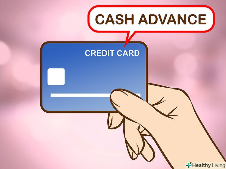 Отримайте аванс за своєю кредитною карткою.багато кредитних компаній відправляють чеки поштою, які ви можете обміняти на готівку або ж зняти гроші в банкоматі зі своєї кредитної картки. Як і з кредитами до зарплати, видача грошей по кредитній картці має високий відсоток, що робить її більш витратною.[15]- Обов'язково читайте дрібний шрифт, щоб знати, який відсоток вам доведеться заплатити за зняття.
