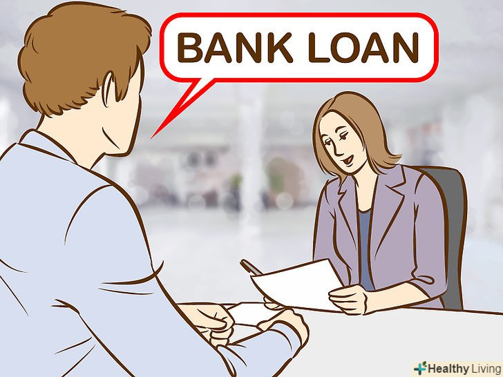 Отримайте кредит у банку.Банківські та кредитні спілки пропонують різні види кредитів. Деякі кредити, на зразок кредиту під заставу житлової нерухомості, зобов'язують вас надати особисте майно в якості застави, якщо ви не зможете виплатити позику. Якщо у вас немає будинку або інших активів, то, залежно від вашого фінансового становища, ви все ще можете отримати споживчий кредит.[16]- Перш ніж брати кредит, перевірте процентну ставку в різних банківських установах. Кредитні спілки часто пропонують більш низьку процентну ставку, ніж в банках.