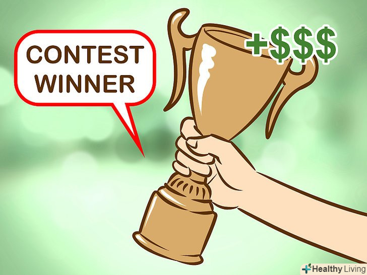 Виграйте конкурс.як і лотерея, конкурс або розіграш можуть за ніч повністю змінити ваше життя. Ваші шанси виграти не настільки високі, але вони все ж є. Чим більше конкурсів Ви відвідаєте, тим більше у вас буде шансів виграти гроші та інші цінні призи.[18]- Перевагою конкурсів над лотереєю є те, що найчастіше участь в них безкоштовно. Пошукайте в інтернеті або в соціальних мережах безкоштовні розіграші або конкурси, в яких ви можете взяти участь. Ви також можете дізнатися про різні конкурси, звертаючи увагу на рекламу на товарах під час покупок. Для участі в багатьох з них не потрібно навіть покупка товару.[19]