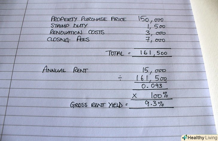 Обчисліть чисту прибутковість від оренди.чиста прибутковість від оренди допоможе вам визначити ефективність вкладень в конкретну нерухомість.- Обчисліть щорічні витрати на нерухомість, склавши витрати на ремонт (за рік), податки на майно, страхування нерухомості і т. п.