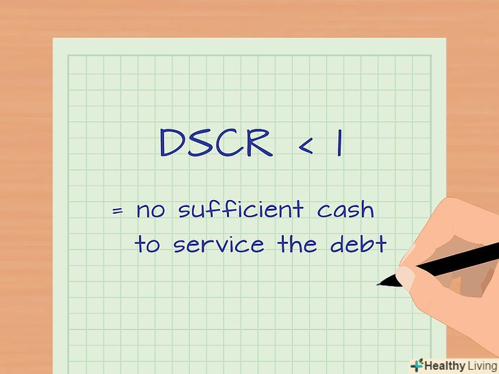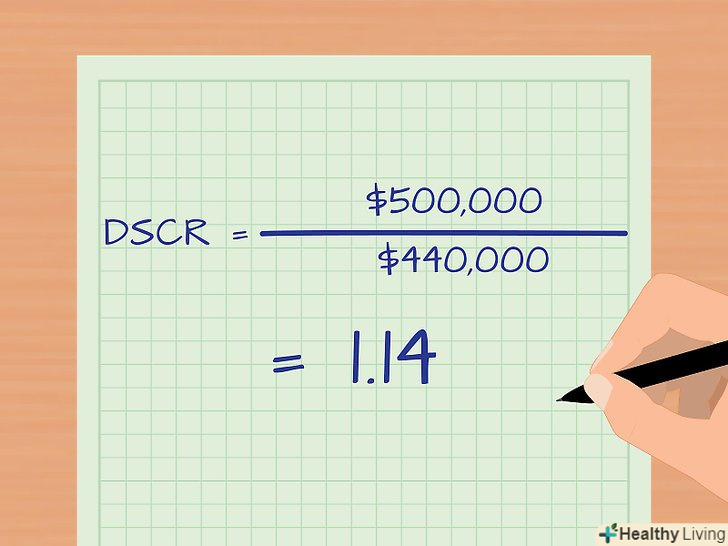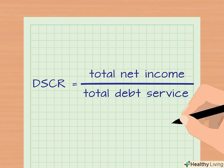 Обчисліть коефіцієнт обслуговування боргу (DSCR).для цього скористайтеся наступною формулою: коефіцієнт обслуговування боргу = чистий прибуток / вартість обслуговування боргу. Наприклад, чистий прибуток деякої компанії становить 50000000 рублів, а вартість обслуговування боргу цієї компанії дорівнює 44000000. В даному випадку вартість обслуговування боргу-це платежі за іпотечними кредитами на нерухомість, якою володіє компанія.[21]- У нашому прикладі коефіцієнт обслуговування боргу дорівнює 50000000/44000000 = 1,14.