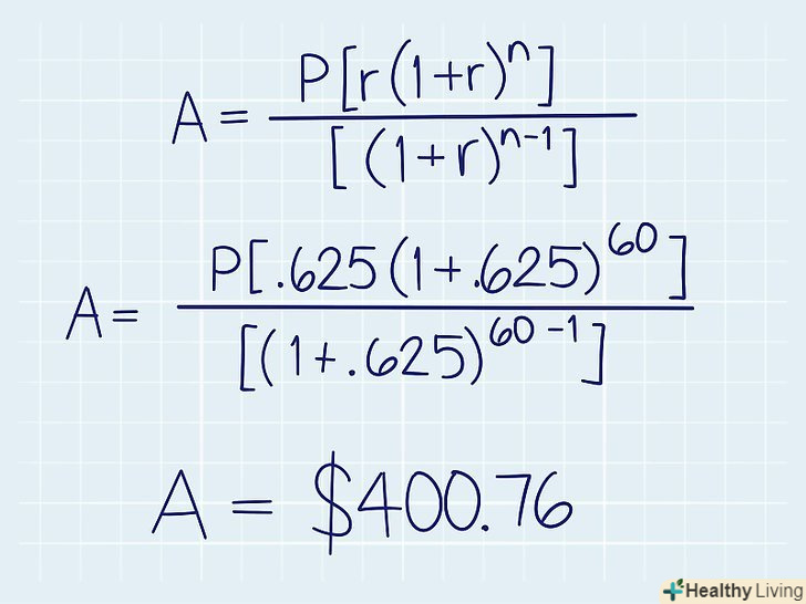 Обчисліть щомісячні платежі за борговими зобов'язаннями.як правило, розрахунком суми щомісячних виплат для погашення позики займається кредитор (людина або організація, яка видала кредит), але ви можете зробити це самостійно. Для початку обчисліть щомісячну процентну ставку; для цього розділіть щорічну процентну ставку на 12. Потім за такою формулою обчисліть суму щомісячних платежів:.