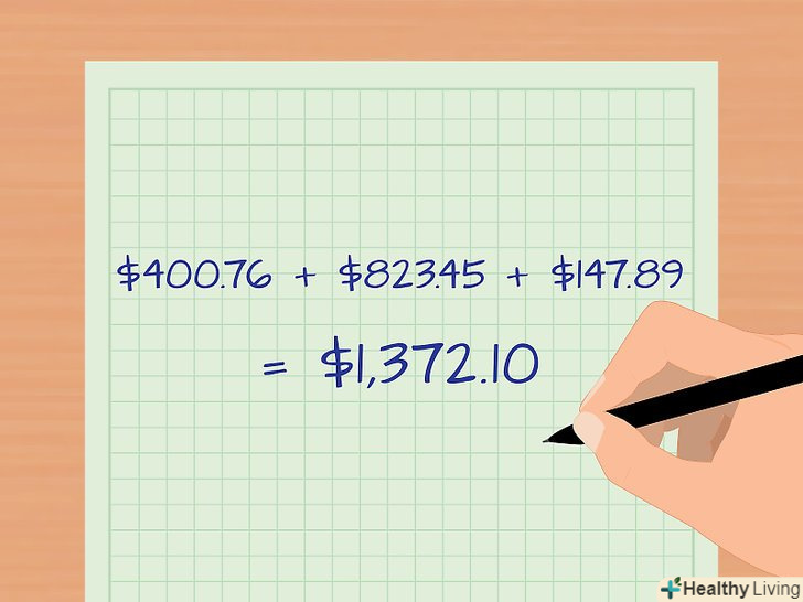 Обчисліть сумарні щомісячні платежі за борговими зобов'язаннями.у цьому випадку почніть з розрахунку щомісячних платежів по кожному Вашому кредиту. Потім складіть отримані значення, щоб обчислити сумарні щомісячні виплати. Визначивши сумарні платежі в рахунок обслуговування боргу, ви можете розрахувати коефіцієнт обслуговування боргу.- Припустимо, що крім кредиту на покупку автомобіля у вас є іпотечний і освітній кредити, щомісячні платежі за якими складають 82345 і 14789 рублів, відповідно.