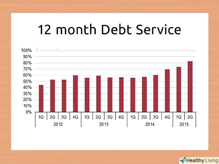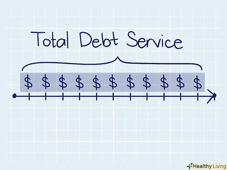 Дізнайтеся, що таке коефіцієнт обслуговування боргу.важливо знати сумарні щомісячні виплати з обслуговування боргу, але для оцінки своєї кредитоспроможності рекомендується визначити відношення чистого прибутку до вартості обслуговування боргу. Таке відношення називається коефіцієнтом обслуговування боргу. Коефіцієнт обслуговування боргу дорівнює певному відсотку від чистого прибутку, який йде на погашення боргових зобов'язань. Коефіцієнт обслуговування боргу обчислюється за такою формулою: коефіцієнт обслуговування боргу = чистий прибуток / вартість обслуговування боргу. Кредитори використовують цей коефіцієнт для визначення здатності позичальника обслуговувати поточні та майбутні боргові зобов'язання. Кредитори хочуть переконатися в тому, що розмір операційного прибутку позичальника достатній для покриття не тільки поточних, але і майбутніх боргів.[19] чим більше значення коефіцієнта, тим впевненіше компанія погашає свої позики.[20]