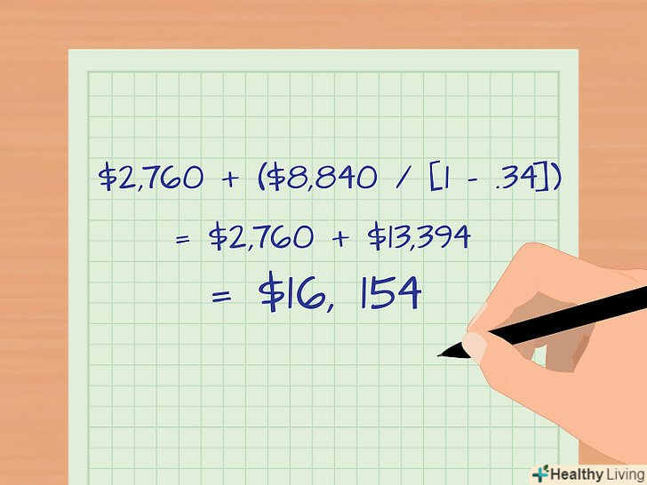 Підкоригуйте платежі за нарахованими відсотками і частини основної суми боргу з урахуванням прибуткового податку. платежі за нарахованими відсотками підхідним податком не обкладаються, чого не скажеш про виплати в рахунок погашення основної суми боргу (для перевірки правильності цього твердження звіртеся з законодавством вашої країни).[14] Підкоригуйте частину основної суми боргу, яка оподатковується прибутковим податком. Якщо ви цього не зробите, ви недооцінюєте вартість обслуговування боргу та переоцінюєте свої можливості щодо обслуговування боргу.[15]- Зробіть коригування за допомогою наступної формули: нараховані відсотки +(частина основної суми боргу/[1-податкова ставка]).