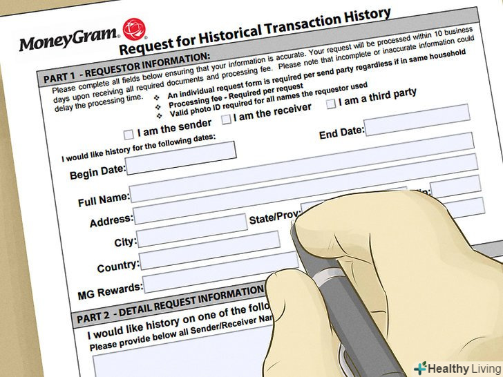 Дістаньте копію історії транзакцій. ви можете зажадати інформацію по транзакціях від 1 до 10 років за певну плату. Для цього ви можете бути відправником, одержувачем переказу або навіть третьою стороною. Цю форму ви можете отримати на сайті MoneyGram, в розділі «Money Order» (Грошові перекази).[16][17][18]- Ця форма являє собою файл PDF, що складається всього з двох сторінок, але подати її необхідно разом з вагомими супровідними документами.
