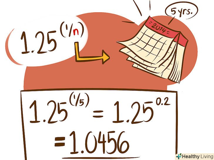 Зведіть отримане значення в ступінь 1 / n, де n-число періодів нарахування відсотка.у нашому прикладі n = 5 років (тобто ви обчислите умовно нараховується відсоток за один рік). Таким чином, 1,25^(1/5) = 1,25^0,2 = 1,0456.