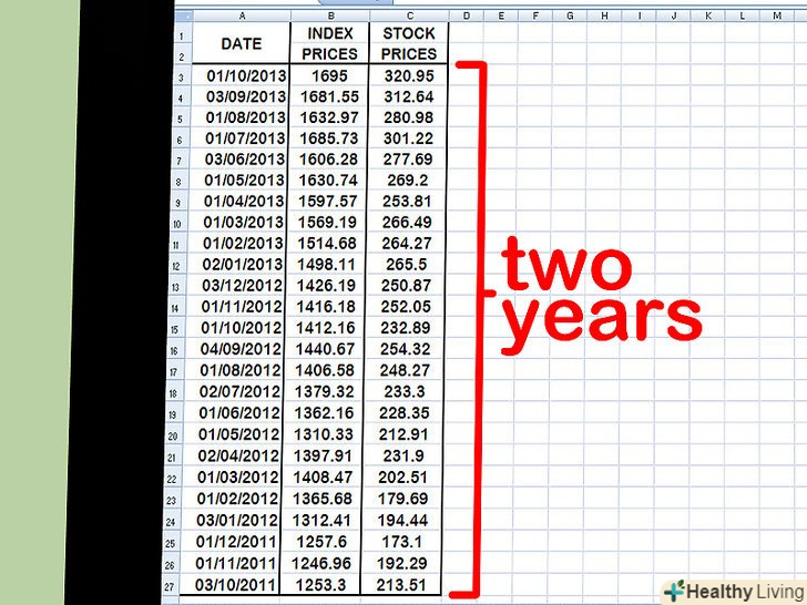 Введіть дані в таблицю.почніть з інтервалу в один місяць. Виберіть дату-наприклад, на початку або в кінці місяця - і введіть відповідне значення ціни для індексу фондового ринку (спробуйте використовувати Samp;P500), а потім значення ціни для даної цінного паперу. Введіть значення для 15 або 30 дат, з можливим продовженням на рік або два тому.- Чим більший часовий відрізок ви оберете, тим точніше буде розрахунок бета.