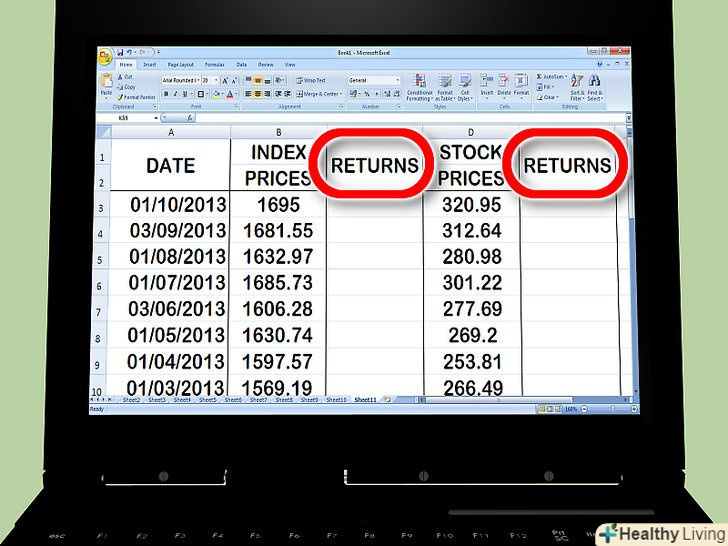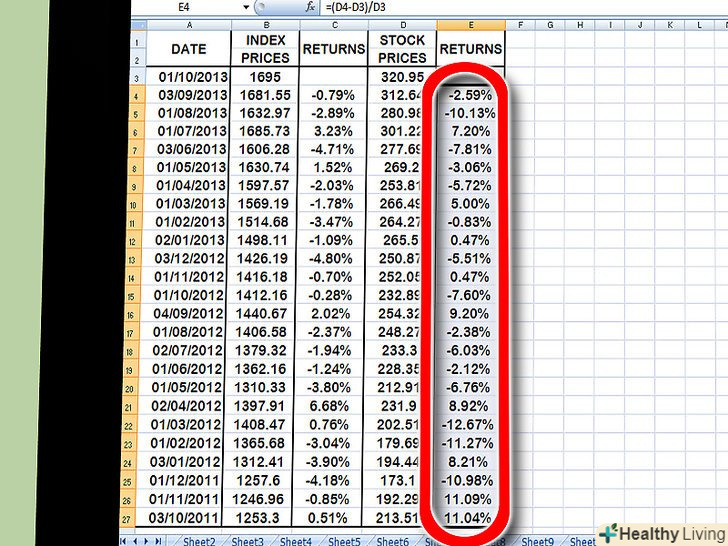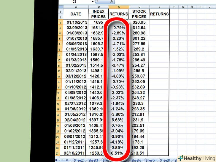 Створіть два стовпці праворуч від стовпців з цінами. Один стовпець для прибутковості індексу, інший - для прибутковості цінного паперу. Використовуйте формулу Excel для визначення прибутковості.