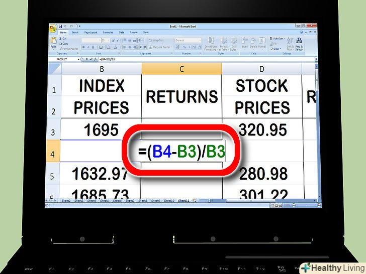 Спочатку знайдемо прибутковість фондового індексу. у другій комірці стовпця для прибутковості індексу введіть " = " (знак рівності). Потім клацніть по другій комірці в стовпці з цінами індексу, введіть " - "(мінус), клікніть по першій комірці в стовпці з цінами індексу, введіть " / " (знак ділення), а потім клікніть по першій комірці в стовпці з цінами індексу. Натисніть "Return" або " Enter.""- У першій комірці нічого не обчислюється, так як вам потрібно мінімум два значення для розрахунку прибутковості; тому ви почнете з другої комірки.