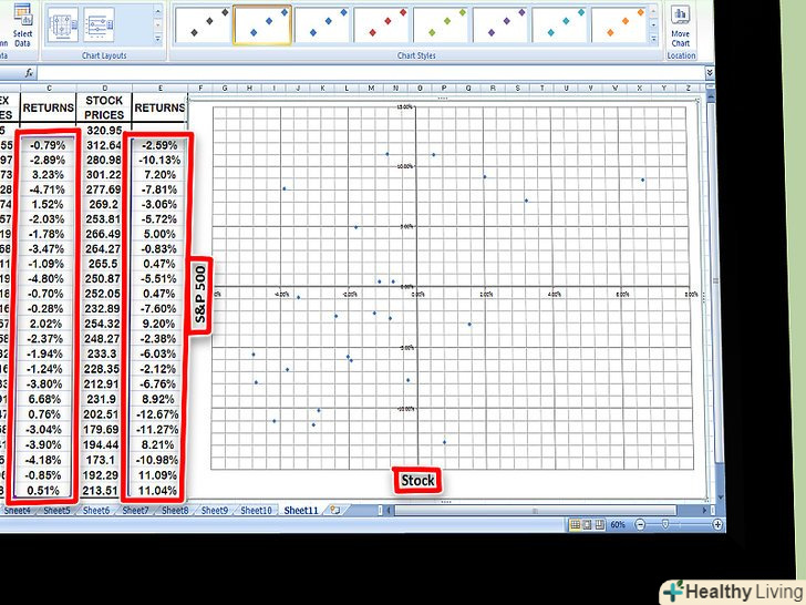 Будівництві графік. виділіть всі дані в стовпцях з прибутковістю і натисніть на значок діаграми в Excel. Виберіть точкову діаграму. Назвіть вісь Х як індекс, який ви використовуєте (наприклад, Samp;P500 ), а вісь Y - як цінний папір.