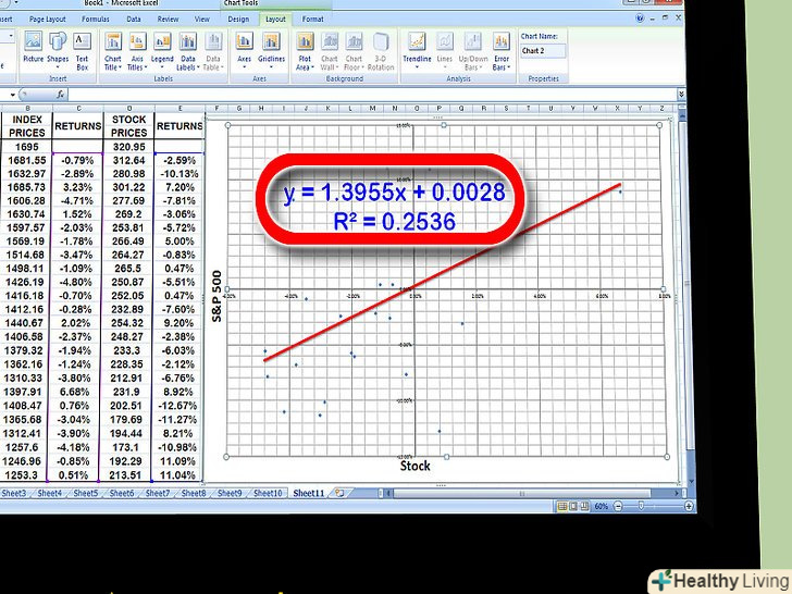 Знайдіть коефіцієнт при " х " в рівнянні лінії тренда. [3] ваше рівняння тренда буде записано у формі: у = βx + а. Коефіцієнт при х і є шуканий бета-коефіцієнт.- Значення R2 є відношенням дисперсії прибутковості цінного паперу до дисперсії прибутковості ринку в цілому (індексу). Велике значення (наприклад, 0,869) вказує на сильну взаємну дисперсію. Мале значення (наприклад, 0,253) вказує на слабку взаємну дисперсію.[4]