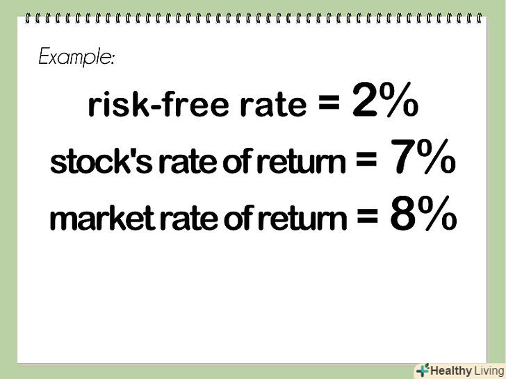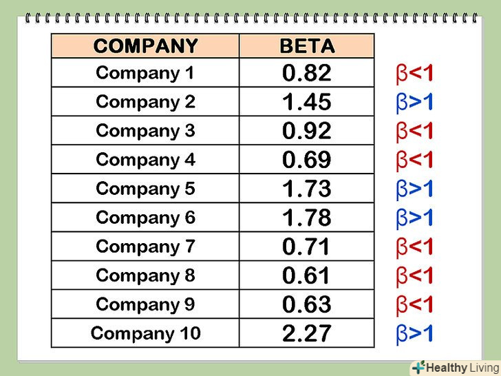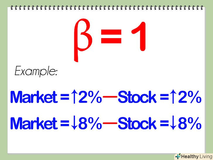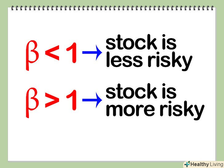 Навчіться інтерпретувати бета-коефіцієнт. Бета характеризує ризик цінного паперу (по відношенню до фондового ринку в цілому), який бере на себе інвестор, що володіє нею. Ось чому ви повинні порівняти прибутковість одного цінного паперу з прибутковістю індексу, який є еталоном. Ризик індексу за замовчуванням дорівнює 1. Значення бета менше 1 означає, що цінний папір менш ризикований, ніж Індекс, з яким його порівнюють. Бета більше 1 означає, що цінний папір є більш ризикованим, ніж Індекс, з яким його порівнюють.- Наприклад, бета компанії ДЖИН = 0,5. У порівнянні з S amp;P500 (еталоном), цінний папір ДЖИН – вдвічі менш ризикований. Якщо S amp;P падає на 10%, ціна паперів ДЖИН матиме тенденцію до падіння тільки на 5%.