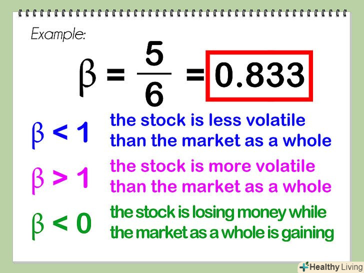 Розділіть значення першої різниці на значення другої.це і є бета, який виражається у вигляді десяткового дробу. Для наведеного вище прикладу, бета = 5/6=0,833.- Бета ринку (індексу) за замовчуванням дорівнює 1, так як Ринок порівнюється сам з собою, а будь-яке число, відмінне від нуля і поділене на себе одно 1.[2] Бета менше 1 означає, що цінний папір менш волатильний, ніж ринок в цілому, в той час як бета більше 1 означає, що цінний папір більш волатильний, ніж ринок в цілому. Бета може бути менше нуля; в цьому випадку інвестор або втрачає гроші на цьому цінному папері, тоді як на ринку в цілому він заробляє (що більш імовірно), або інвестор заробляє на цьому цінному папері, тоді як втрачає гроші на ринку в цілому (що менш імовірно).