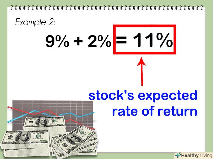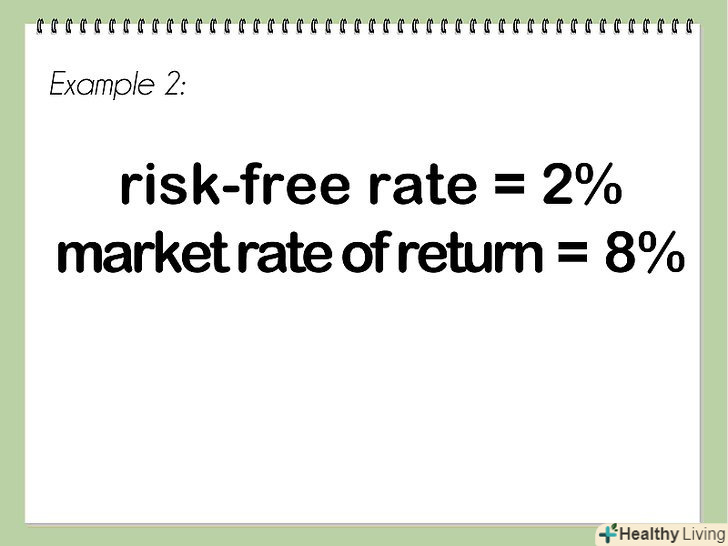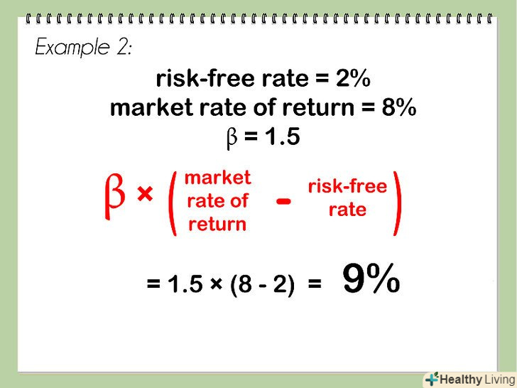 Помножте бета на різницю між ринковою прибутковістю і безризиковою ставкою. у цьому розділі ми будемо використовувати бета рівний 1,5. Отже: (8 – 2)*1,5 = 9%.