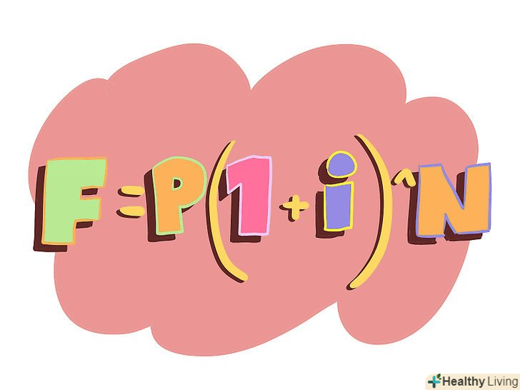 Знайте, формулу, яку потрібно використовувати, щоб обчислити загальну суму, яку Ви виплатите. щоб знайти підсумкову суму, що виплачується в кінці встановленого терміну, за який ви повинні виплатити вашу позику, вам потрібно помножити основну суму кредиту на суму процентної ставки і 1. Потім, звести цю суму в ступінь, рівну кількості років. Сама формула виглядає ось так:- F = P(1 + i)^N