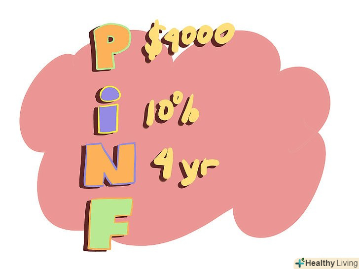 Пробіжіться по вищенаведеній формулі і визначте, які числа підставляються в які змінні.у більшості випадків, завдання на процентні ставки будуть наведені в письмовому вигляді, а вам потрібно буде здогадатися, яке число і що воно представляє. Наприклад, вам дано: «ви зайняли $4000 в банку і зобов'язалися повернути початкову позику з нарахованим відсотком через 4 роки за ставкою 10% в рік. Яку суму ви заплатите через 4 роки?».- P буде $ 4,000.