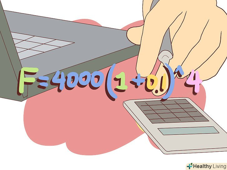 Підставте відомі числа в формулу за фіксованою процентною ставкою.як тільки ви зрозуміли, які числа і що позначають, підставте їх у формулу, щоб знайти фіксовану ставку. Наша формула буде виглядати наступним чином:- F = 4000(1 + 10%)^4. Потрібно відзначити, що найлегше вирішувати завдання, якщо ви переведете ставку у відсотках в десятковий вид, так, що формула набуде вигляду F = 4000(1 + 0.1)^4