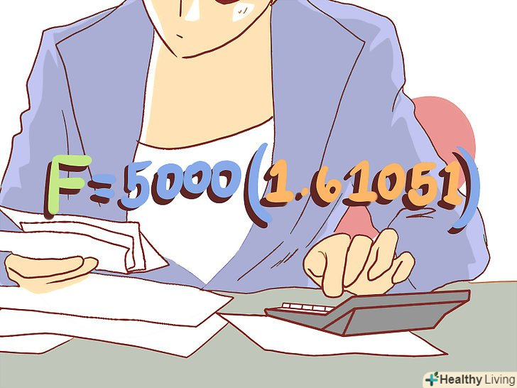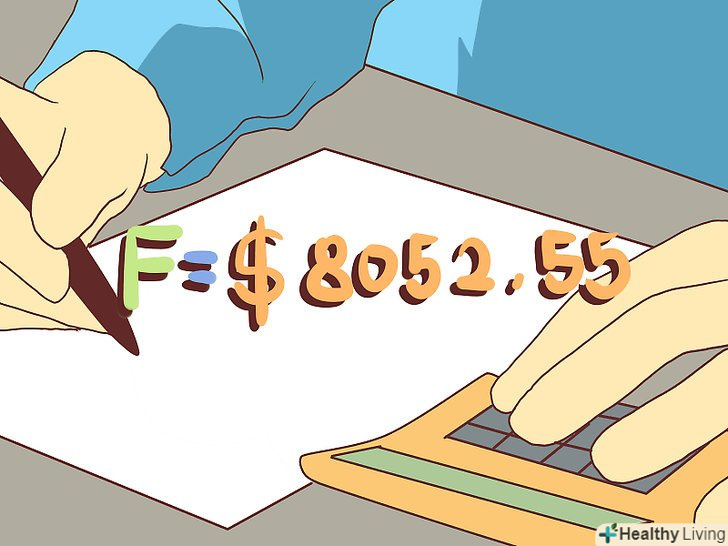 Закінчите вирішувати рівність.зараз у вас повинен залишитися останній крок для вирішення всієї рівності. Щоб завершити обчислення за формулою і знайти F, або підсумкову суму виплат, вам потрібно помножити P на значення в дужках. У нашому випадку:- F = 5000 (1.61051) тим самим, F = $8,052.55. Це означає, що через 5 років вам доведеться виплатити $8,052.55.