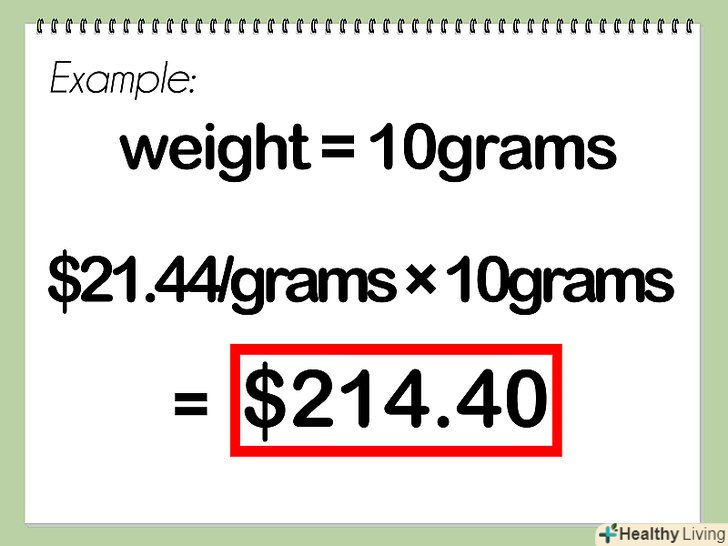 Помножте ціну за грам на вагу в грамах.якщо у Вас є 10 грамів золота і ви розрахували ціну як $21,44 за грам , то Ваш лом золота коштує 10 х $21,44 = $214,40. Ось деякі приклади:- Якщо у вас є 5 грамів 14k золотого брухту і поточна ціна $1,600, то $1600 поділене на 31,1 дорівнюватиме USD $ 51,45. Цю цифру множимо на 0,5833 (14k) і знаходимо $30,01 за грам. $30,01 помножене на 5 грам дорівнює $ 150,05.