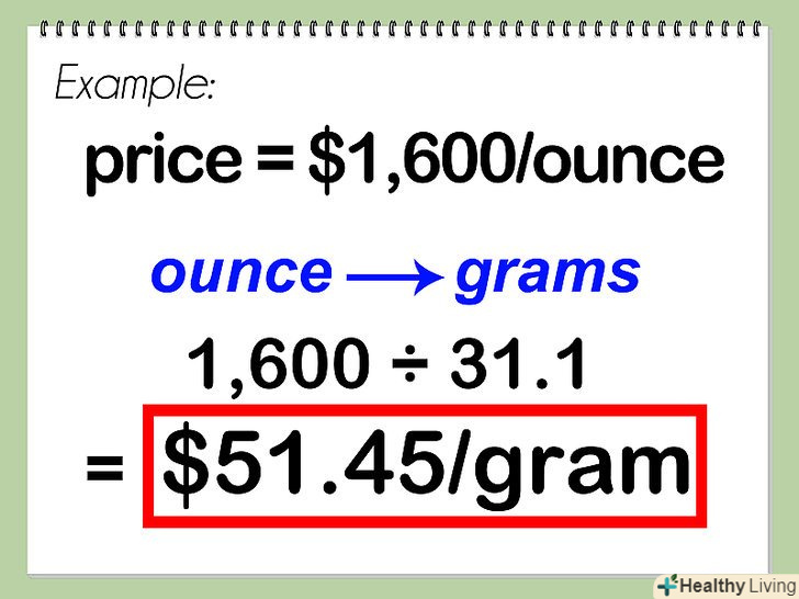 Розділіть поточну ціну на золото (за унцію в доларах США) на 31,1 для обчислення поточної ціна на золото за 1 грам.наприклад, якщо поточна ціна за унцію становить $1600 доларів, то поточна ціна за грам буде дорівнює $51,45 ($1600 / 31,1).