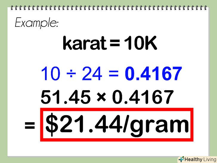 Розділіть число каратів на 24, а потім помножте результат на поточну ціну на золота за грам.наприклад, якщо у Вас є 10 каратне (10K) золото і його поточна ціна становить $1600 доларів за унцію, або $51,45 за грам ($1600 / 31,1), то ціна вашого золотого брухту дорівнює USD $51,45 х 0,4167 = USD $21,44 за грам.- 10k = 10/24 = 0,4167