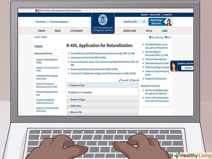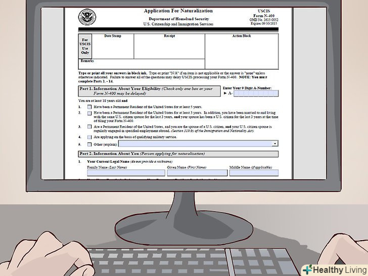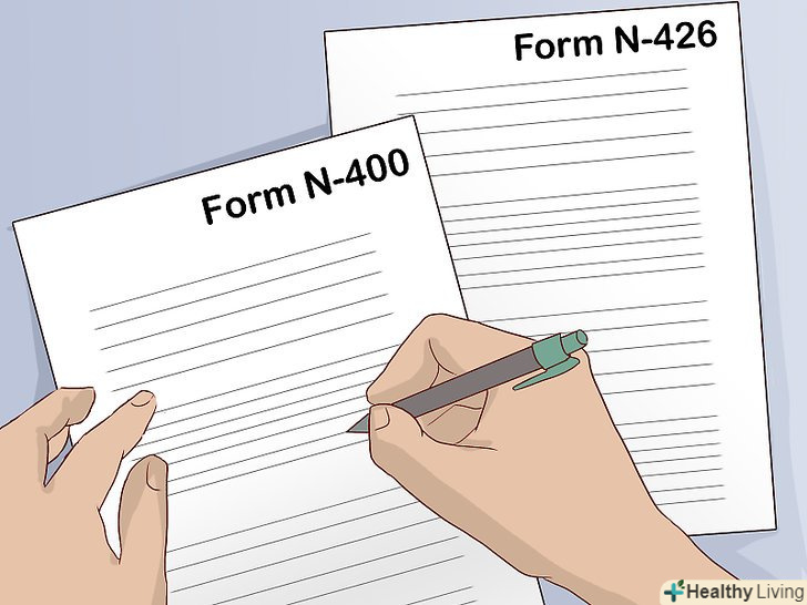 Подайте заявку на натуралізацію.Скачайте форму N-400 "Application for Naturalization" (заява на натуралізацію) і або введіть інформацію на комп'ютері і роздрукуйте, або акуратно заповніть бланк друкованими літерами чорною ручкою. Обов'язково попередньо скачайте і прочитайте інструкції щодо заповнення форми.[8]- До заяви буде необхідно додати підтверджуючі документи. Прочитайте інструкції, щоб дізнатися перелік наданих документів. Наприклад, вам буде необхідно надати копію своєї грін-карти.