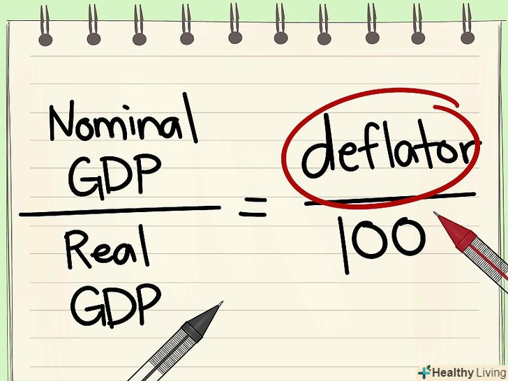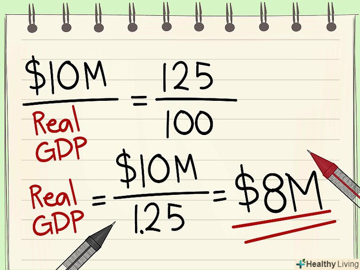 Обчисліть за дефлятором номінальне ВВП.реальне ВВП, у свою чергу, дорівнює "номінальне ВВП / 100". Пропорція така: номінальне ВВП / реальне ВВП = дефлятор / 100.- Припустимо, номінальне ВВП становить 10 мільйонів, дефлятор дорівнює 125. Ось що ми отримуємо: