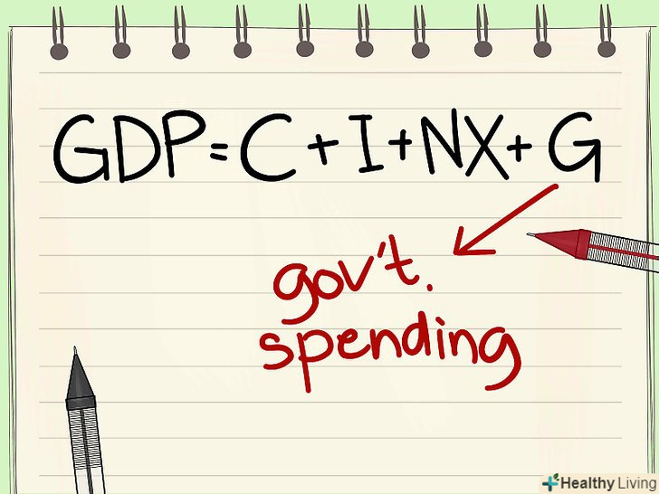 Додайте урядові витрати.при обчисленні ВВП не слід забувати про все те, на що витратив гроші уряд.- Зарплати бюджетникам? Витрати на об'єкти інфраструктури? На оборонку? Всі туди. А ось страховка і допомоги по безробіттю сюди вже не вписуються, так як ці гроші не витрачаються, а як би передаються.