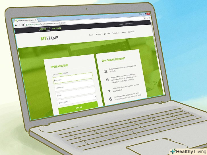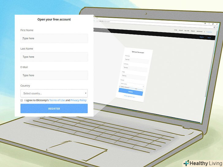 Зареєструйте акаунт. щоб зареєструвати аккаунт, потрібно надати ім'я, дату народження, фізичну адресу, адресу електронної пошти, номер телефону та іншу особисту інформацію. Вас також попросять надати дані банківського рахунку, електронної платіжної системи, на зразок PayPal, або і те і інше (в залежності від того, як ви хочете перевести і обміняти біткоіни).[4]