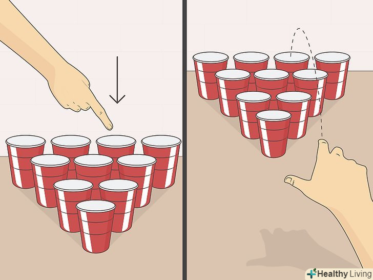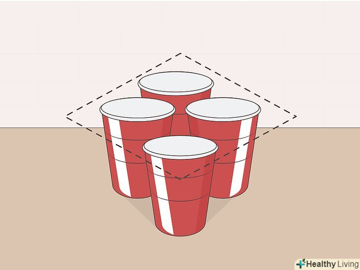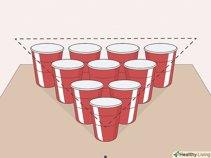 Розставте по 10 стаканчиків у вигляді трикутника на кожній стороні столу.передні кути трикутників повинні вказувати один на одного. Таким чином, в першому ряду буде один стаканчик, у другому — 2, в третьому — 3, а в основі — 4. Не нахиляйте стаканчики.[2]- Ви також можете грати з 6 стаканчиками.