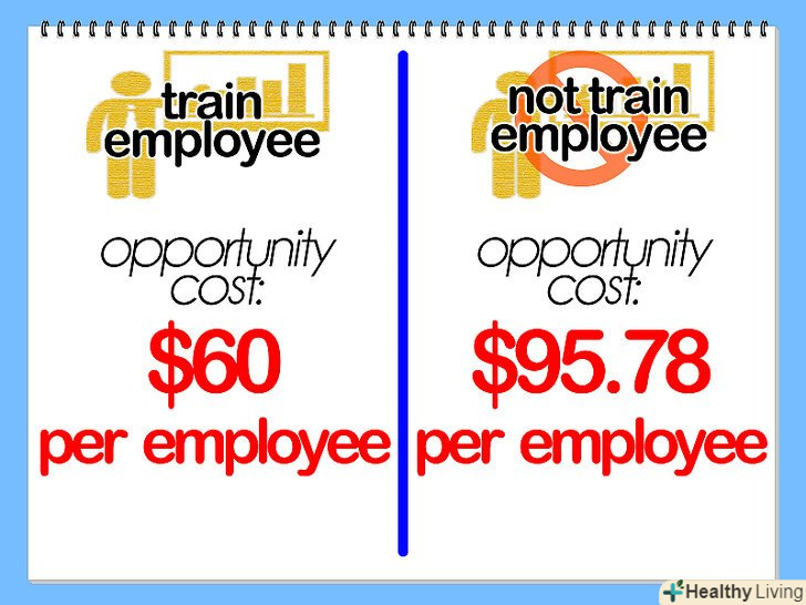 Тепер розглянемо витрати на навчання співробітників.тут 2 варіанти: провести навчання, що дозволить збільшити продуктивність праці співробітників, або дозволити їм працювати в звичайному режимі (без навчання).- Розрахуйте альтернативні витрати на навчання, якщо на нього відводиться половина робочого дня (4 години). Помножте погодинну заробітну плату одного працівника на кількість годин навчання. Наприклад, якщо погодинна заробітна плата становить $15, помножте $15 на 4. Тепер помножте $60 на кількість співробітників, які проходять навчання. Якщо це 2 людини, то $120-альтернативні витрати навчання всіх працівників або $60 на одного працівника.