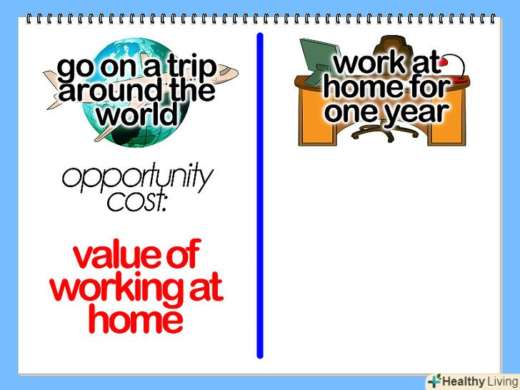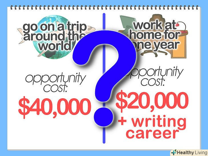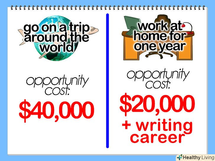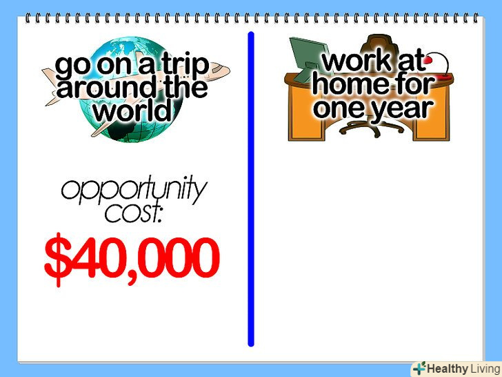 Оцініть перший варіант на основі того, які результати будуть досягнуті, якщо ви оберете інший варіант..- Наприклад, альтернативними витратами навколосвітньої подорожі будуть доходи від роботи вдома.