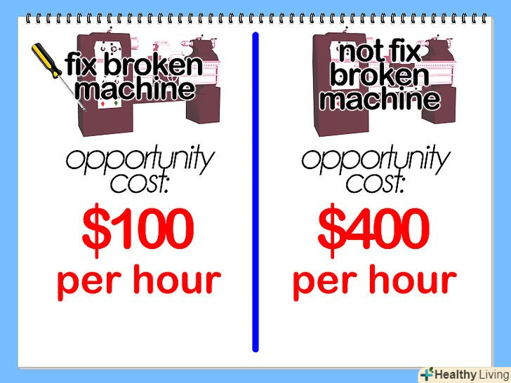 Розглянемо альтернативні витрати на прикладі виробництва.альтернативні витрати часто розраховується як втрата маржинального прибутку, якщо частина виробничих потужностей простоює. .- Припустимо, є дві машини на нашому виробництві. Одна машина зламалася, і її простий обходиться в $100 на годину у вигляді заробітної плати. За одну годину виробляється продукції на $500. Альтернативні витрати складають $400 на годину для кожної машини. Тепер ви можете оцінити значимість швидкості ремонту машини на основі альтернативних витрат за кожен день простою. Для 8-годинного робочого дня альтернативні витрати становлять $3200.