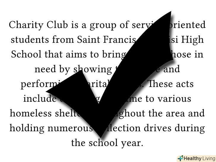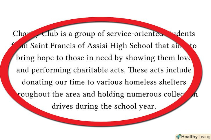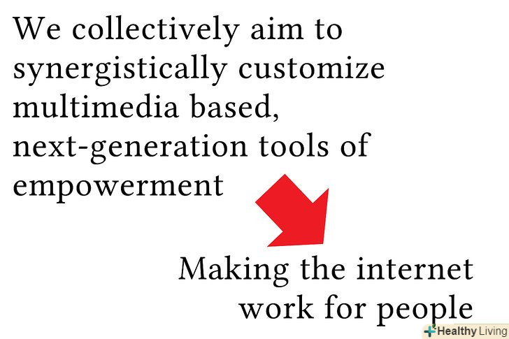 Отсейте неважливе.місія організації, в якій занадто багато непотрібних деталей, може вийти дуже заплутаною. «Ми колективно прагнемо синергетично налаштувати Мультимедіа на основі інструментів розширення можливостей наступного покоління". Що? Коли ви пишете місію організації, обережно вибирайте слова, які насправді означають щось для вас і вашої організації. Пам'ятайте, що завдання місії розповісти правду про вашу організацію. Пишіть те, що Ви знаєте!