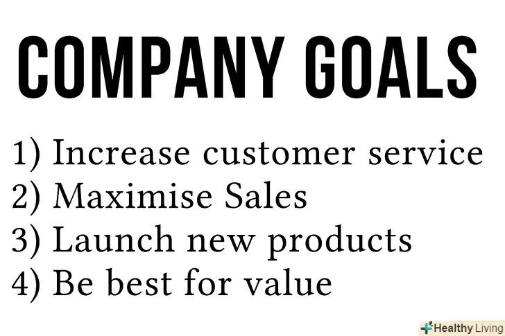Складіть список конкретних цілей вашої організації.нарешті, ваша місія повинна містити одну або кілька основних цілей. Які Ваші плани на майбутнє? Які плани вашої організації найближчим часом? Що є вашим основним заняттям?- Ваші завдання можуть бути сконцентровані на обслуговуванні клієнтів, домінування певного ринку, допомоги людям зробити їх життя краще за допомогою вашого продукту, і т. д.