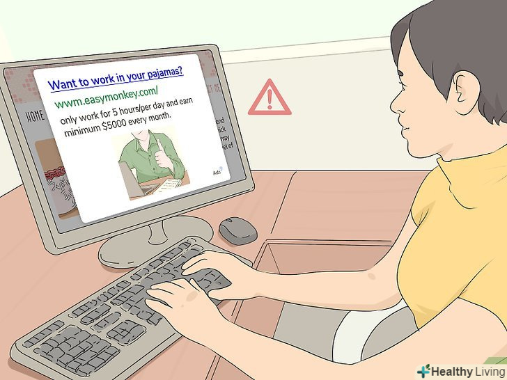 Остерігайтеся пропозицій, які здаються занадто хорошими, щоб бути правдою.якщо в оголошенні обіцяють величезну зарплату за віддалену роботу, насторожитеся. Якщо щось здається занадто хорошим, щоб бути правдою, швидше за все, це не правда. Вивчіть інформацію про компанію, щоб переконатися, що їй можна довіряти. Є й інші ознаки шахрайських схем:[20]- Фрази про те, що для виконання роботи не потрібні спеціальні навички або знання