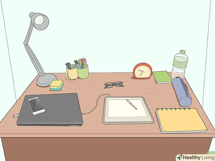Звільніть робоче місце від зайвого.позбудьтеся від усього, що вам не потрібно під час роботи. Можна залишити пару дрібниць або фотографії близьких людей, проте все інше слід прибрати в іншу кімнату (або хоча б перекласти в інше місце). Вам потрібно буде створити простір, де ніщо не буде відволікати вас від роботи. В кінці кожного робочого дня наводите порядок на столі і прибирайте все зайве. Бардак на ранок буде тільки збивати весь робочий настрій.[2]- Якщо ви часто влаштовуєте безлад на робочому столі, виділяйте 15 хвилин на наведення порядку щодня.