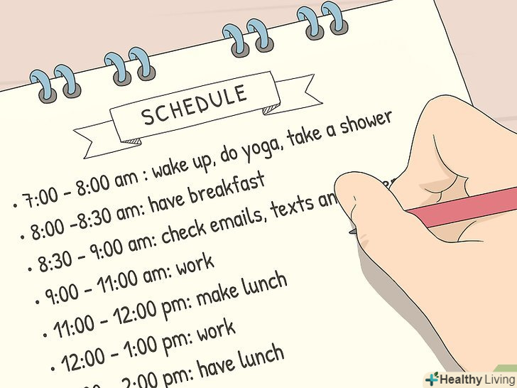 Продумайте робочий графік і дотримуйтеся його.навіть якщо у вас є можливість самостійно визначати, в який час ви будете працювати, важливо дотримуватися одного і того ж графіка. Подумайте, в який час вам буде найзручніше працювати, і витрачайте цей час тільки на роботу. [4]- По можливості працюйте у відповідний для себе час. Наприклад, якщо ви більш ефективні вранці, починайте працювати раніше, щоб у вас були сили для найважливіших завдань.