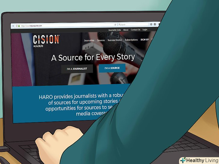 Співпрацюйте з репортерами.приватний підприємець володіє певним досвідом в обраній галузі. Репортерам постійно потрібні цитати реальних людей, які можна використовувати в сюжетах, тому розвивайте такі відносини.[18] Згадка в газетній статті підвищує впізнаваність бренду.- Використовуйте профільні сайти, на яких можна залишати свої контактні дані, щоб репортери могли зв'язатися з вами.