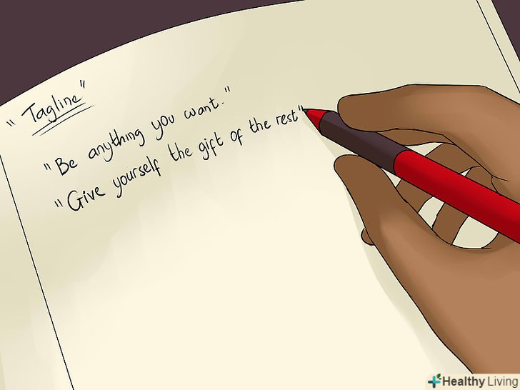 Придумайте слоган.Слоган-лаконічна фраза, в якій укладена суть діяльності вашої компанії.[7] Слоган повинен доповнювати існуючий логотип. Якщо ви плануєте використовувати слоган як товарний знак або знак обслуговування, то його також необхідно зареєструвати.[8]- Наприклад, слоган Nike" Just Do It " (Просто зроби це) відмінно доповнює динамічний логотип компанії. Він містить в собі рух, атлетизм і швидкість.