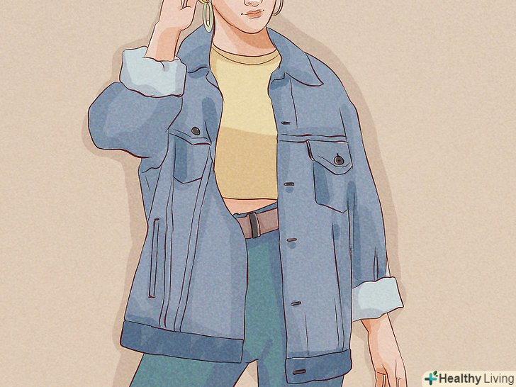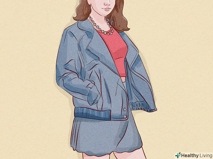 Продумайте свій образ. 80-ті були часом експериментів з різними стилями. Жіноча мода прагнула до об'ємного "верху «і маленькому»низу". Кофта вільного розміру поєднувалася з міні-спідницею [5] і щільними колготками або лосинами.- Якщо у вас немає топа вільного розміру або звужених штанів, пошукайте в гардеробі батьків (може, у них знайдеться справжній одяг з 80-х). Молодші брати і сестри можуть поділитися з вами своїм облягаючим одягом, яка вам трохи замала.