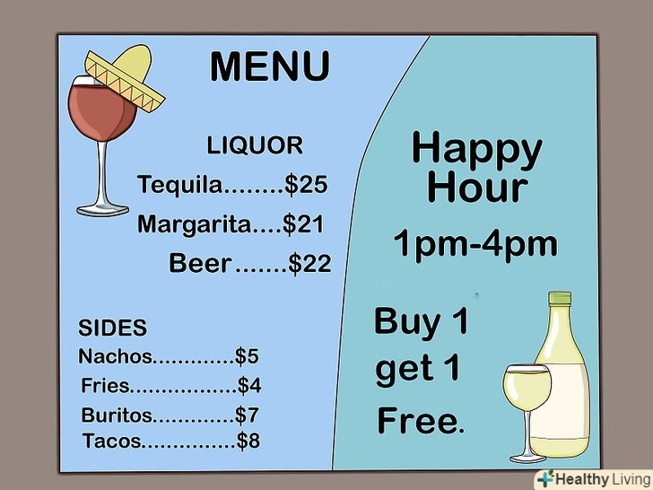Створіть меню.якщо ви плануєте подавати їжу і якісні коктейлі, витратьтеся на хороші інгредієнти, пам'ятайте: свіже завжди краще. Зробіть так, щоб меню вашого бару вписувалося в концепцію, якщо вона є. Бар на мексиканську тему без текіли, корони і маргарит – халтура.- Подумайте про спеціальне меню для годин знижок. Особливого доходу це не принесе, але зате приверне клієнтуру, а деякі клієнти затримаються і після закінчення годин знижок.
