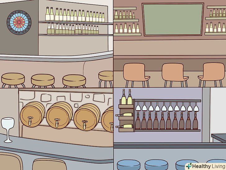 Виберіть оформлення бару.це не повинно бути зухвало агресивно. Непомітність теж може спрацювати. Але краще, щоб відразу було зрозуміло, що це за бар. Так що це буде?- Бар по сусідству. Тут роботяги збираються по середах, п'ють пиво і, може, грають в більярд. Цей тип бару-найпоширеніший, ідеально підходить для невеликих посиденьок.[3]