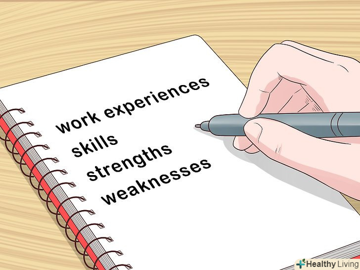 Складіть список своїх сильних і слабких сторін.перш ніж спробувати створити нову посаду, важливо подумати, яку користь ви приносите компанії. Можливо, ви виявите, що ви не використовує в роботі свої сильні сторони. Слабкі сторони можуть заважати вашому прогресу. Складіть список всіх своїх якостей, щоб зрозуміти, як можна поліпшити свою роботу.[1]- Створення нової посади на роботі дуже схоже на співбесіду. Ваші сильні сторони можуть не тільки допомогти вам придумати нові ролі в компанії, але і дозволять компанії доручити вам нові завдання.