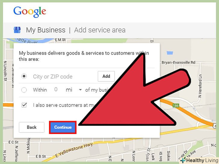 - Не забудьте поставити галочку в поле "так, обслуговує" на сторінці " Ваша компанія обслуговує клієнтів за іншими адресами?", якщо це так. Потім вкажіть територію обслуговування, ввівши назву міста або поштовий індекс регіону, який ви обслуговуєте.