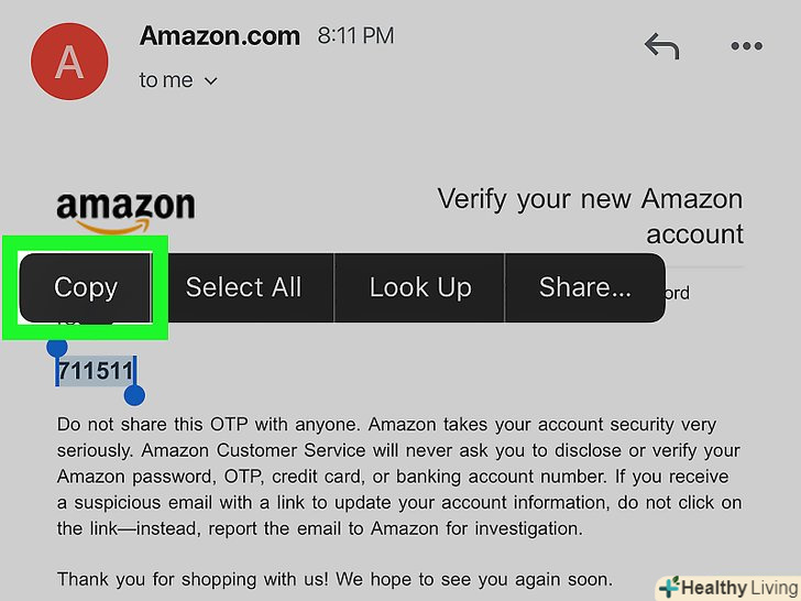 Скопіюйте або запишіть одноразовий пароль.одноразовий пароль-це шестизначний пароль, виділений жирним шрифтом в центрі листа. Запишіть або скопіюйте цей пароль.- Якщо ви не отримали листа від Amazon, перевірте введену адресу електронної пошти та натисніть "Resend OTP" (Повторно надіслати OTP) внизу сторінки реєстрації Amazon.